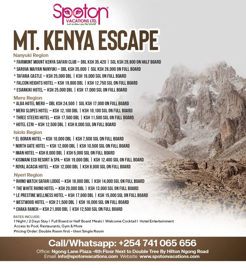 Experience a refreshing highland retreat across the Mount Kenya region with scenic landscapes, cool mountain air, and comfortable stays in Nanyuki, Meru, Isiolo, and Nyeri.
